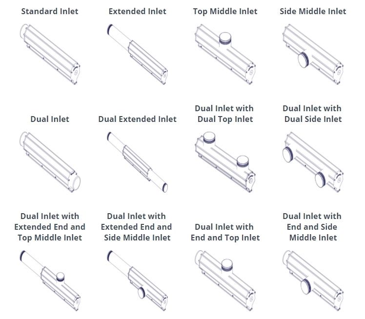 - Ножи с двумя впускными патрубками (рекомендуется длина превышает 60" или 1524 мм) с различной конфигурацией размещения (см. ниже);